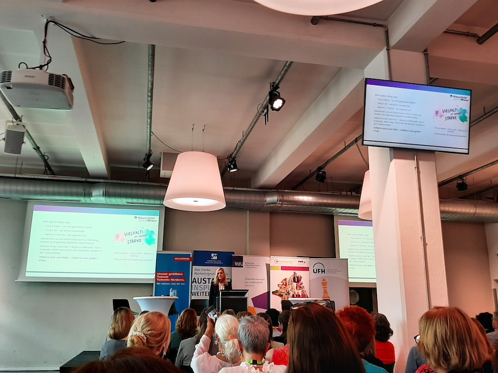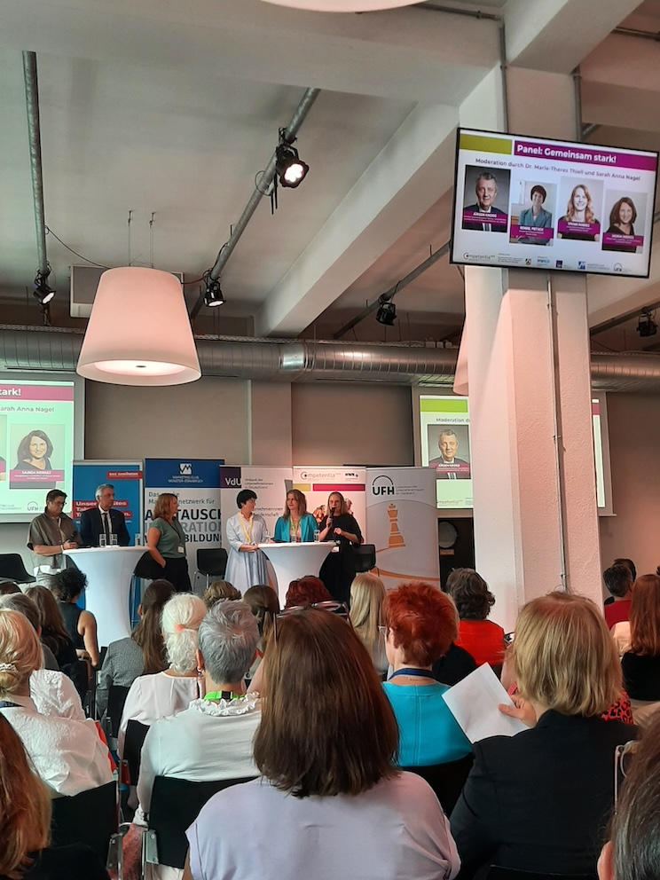 Im Eingangsbereich traf ich dann auf Melanie Lohmann. Wie schön, dass wir uns wieder gesehen und direkt über Vereinbarkeit von Familie und Beruf sprechen konnten – ein Thema, das uns beide privat und beruflich bewegt und das sich auch in der Keynote, den Impulsen und der Panel-Diskussion wiederspiegelte:
